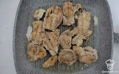 Разогрейте сковороду с растительным маслом и отправьте курицу обжариваться. Примерно по 5 минут на каждую сторону.