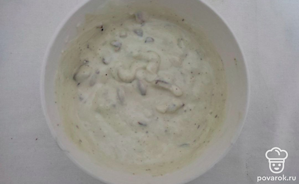 Смешайте майонез, винный уксус, горчицу, измельченные чеснок и кешью, соль и черный молотый перец. Отложите соус в холодильник.