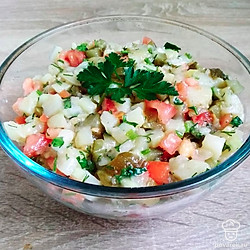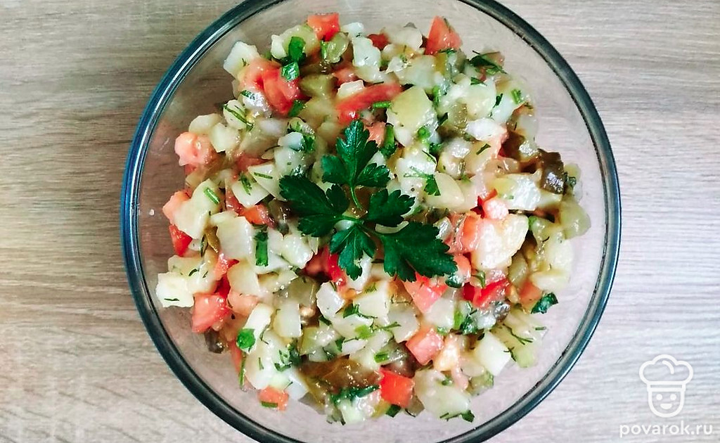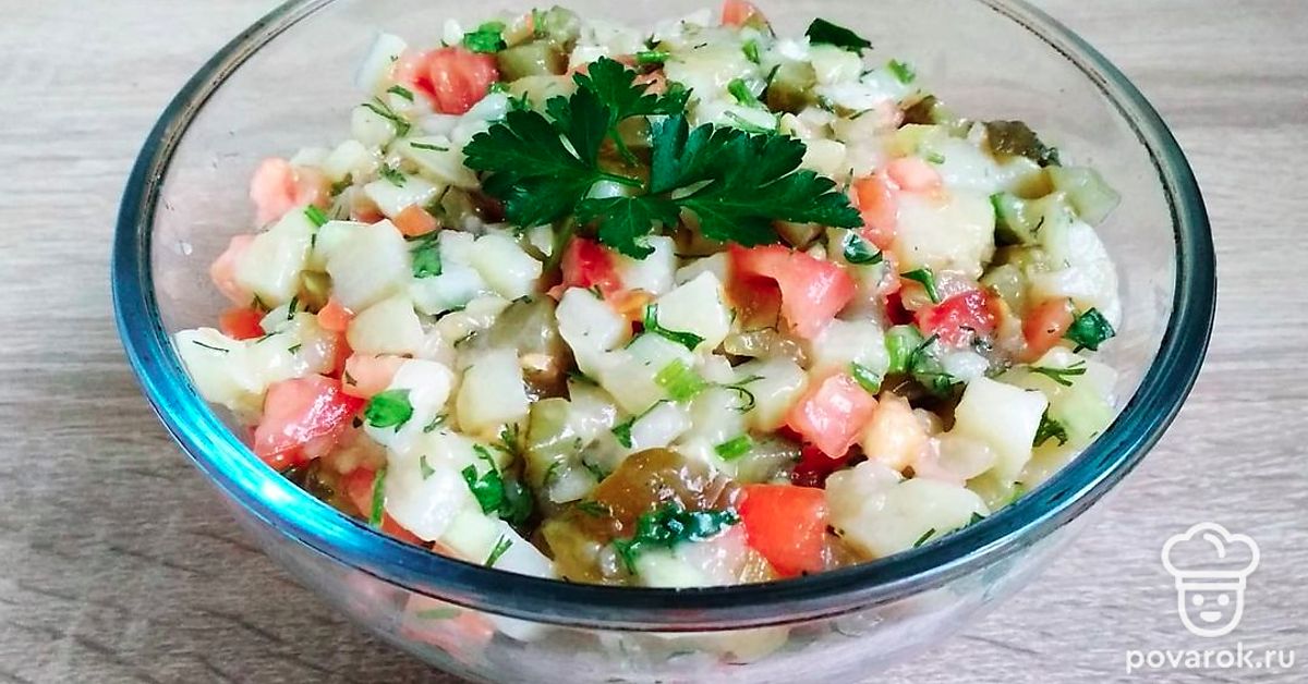Пикантный салат из маринованных огурцов, помидор и картофеля