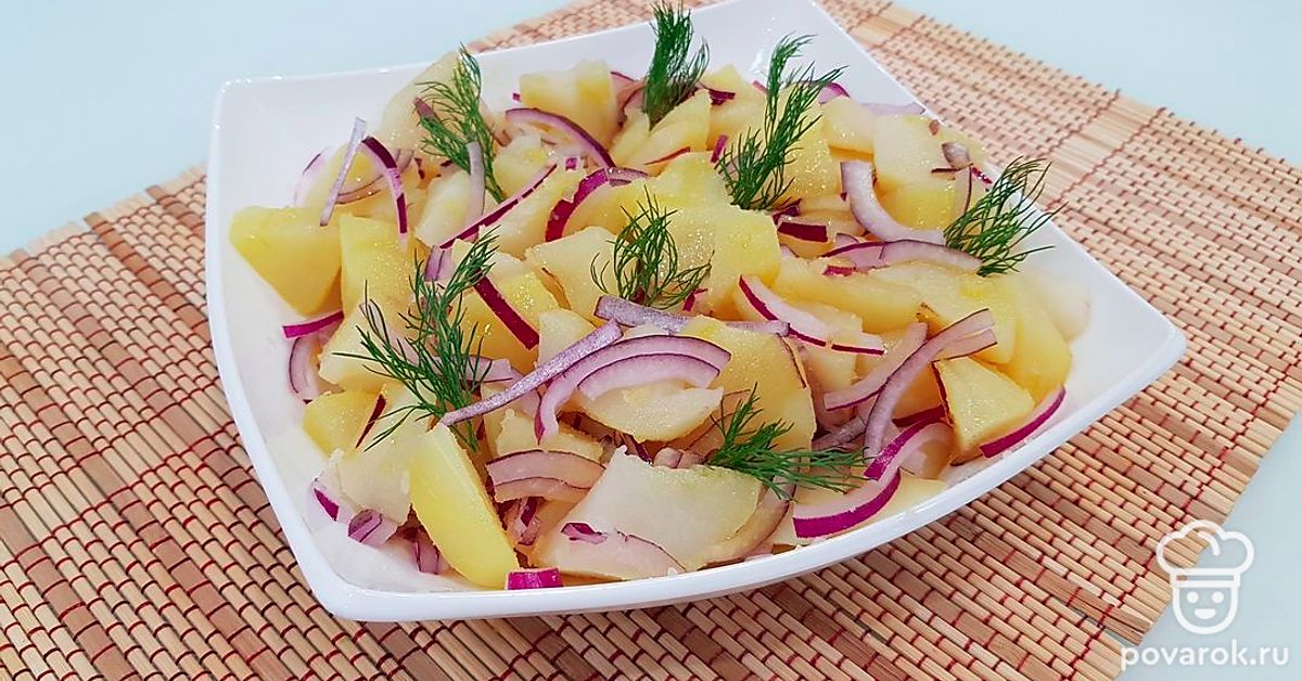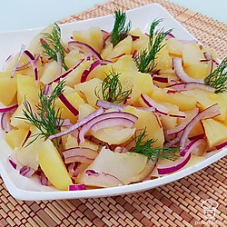 Этот картофельный салат очень аппетитный и вкусный, не смотря на то, что очень простой. Главный ингредиент придающий яркий вкус салату является льняное масло. Полезные свойства льняного масла обусловлены содержанием незаменимых полиненасыщенных жирных кислот: альфа-линоленовой (омега 3), триглицерида линоленовой кислоты. Следовательно, такой салат не только вкусный, но и очень полезный.