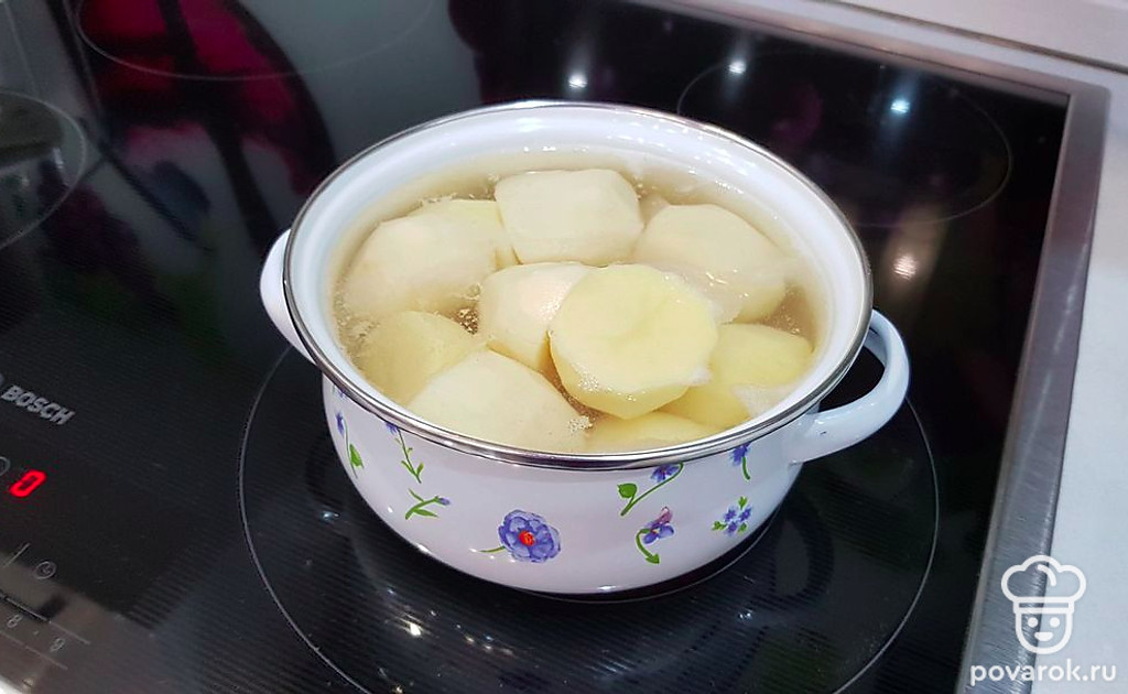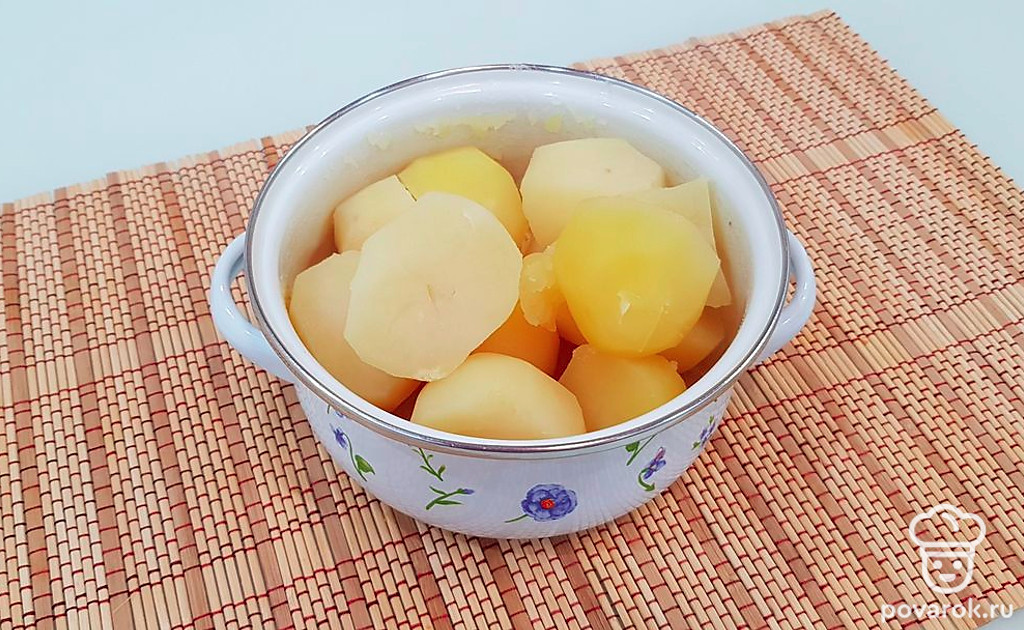 Из отварного картофеля слейте воду и дайте ему полностью остыть.