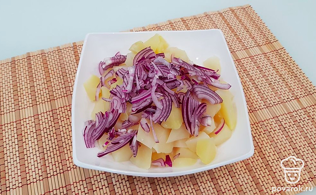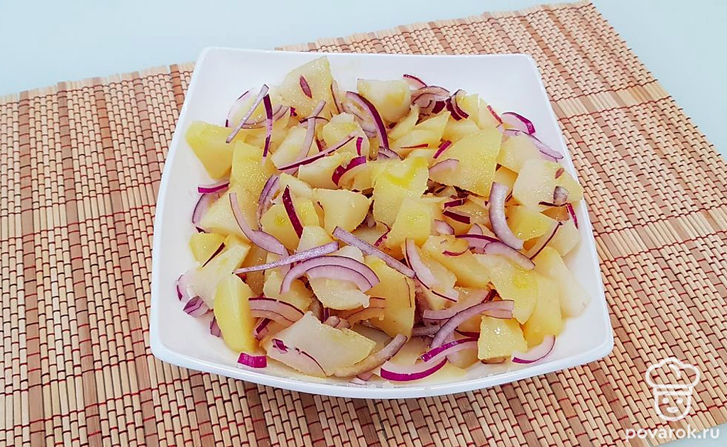 Нарежьте картофель произвольными кусочками, только не мельчите. Сложите в салатник.