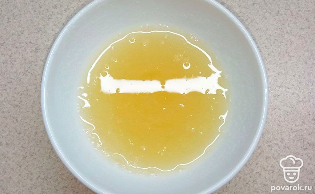 Всыпьте желатин в небольшую керамическую чашку и залейте 4 ст.л. воды, Оставьте на 10-15 минут. За это время желатин напитается водой и его легко можно будет растопить в микроволновке.