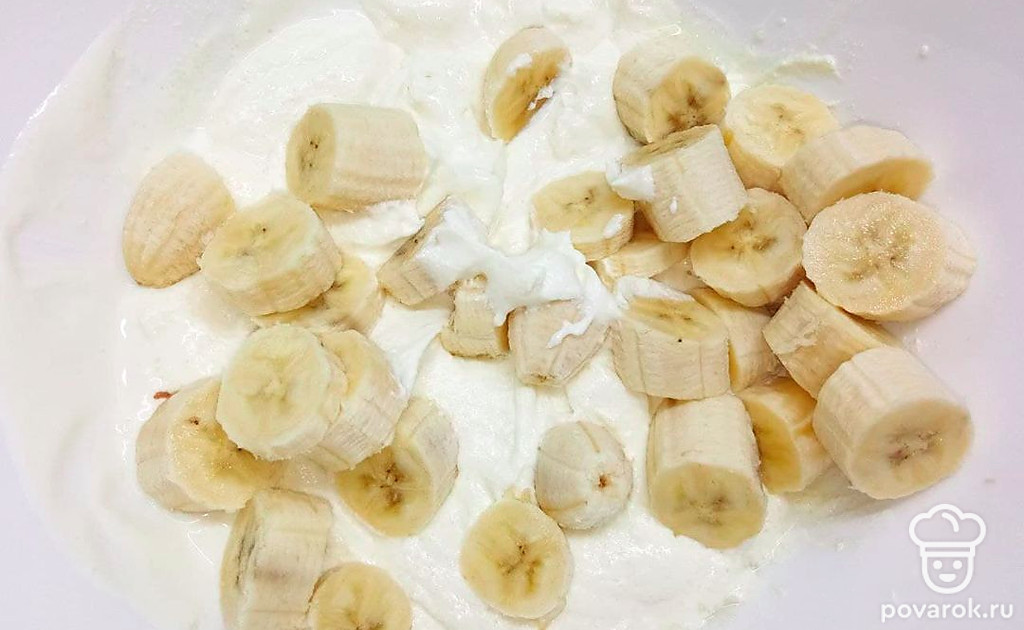 2 банана очистите от кожуры, нарежьте небольшими кружочками и также отправьте в чашу блендера. Пробейте массу до однородного состояния. Затем добавьте к этой массе растопленный и слегка охлажденный желатин.