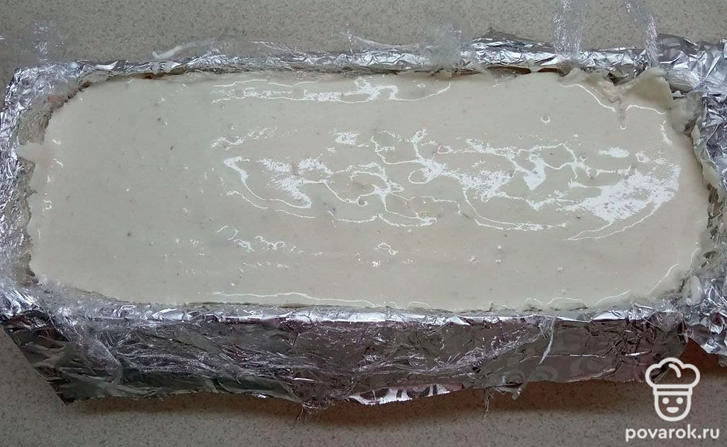 Подготовьте форму подходящего размера и пищевую пленку, чтобы было удобно сформировать террин.