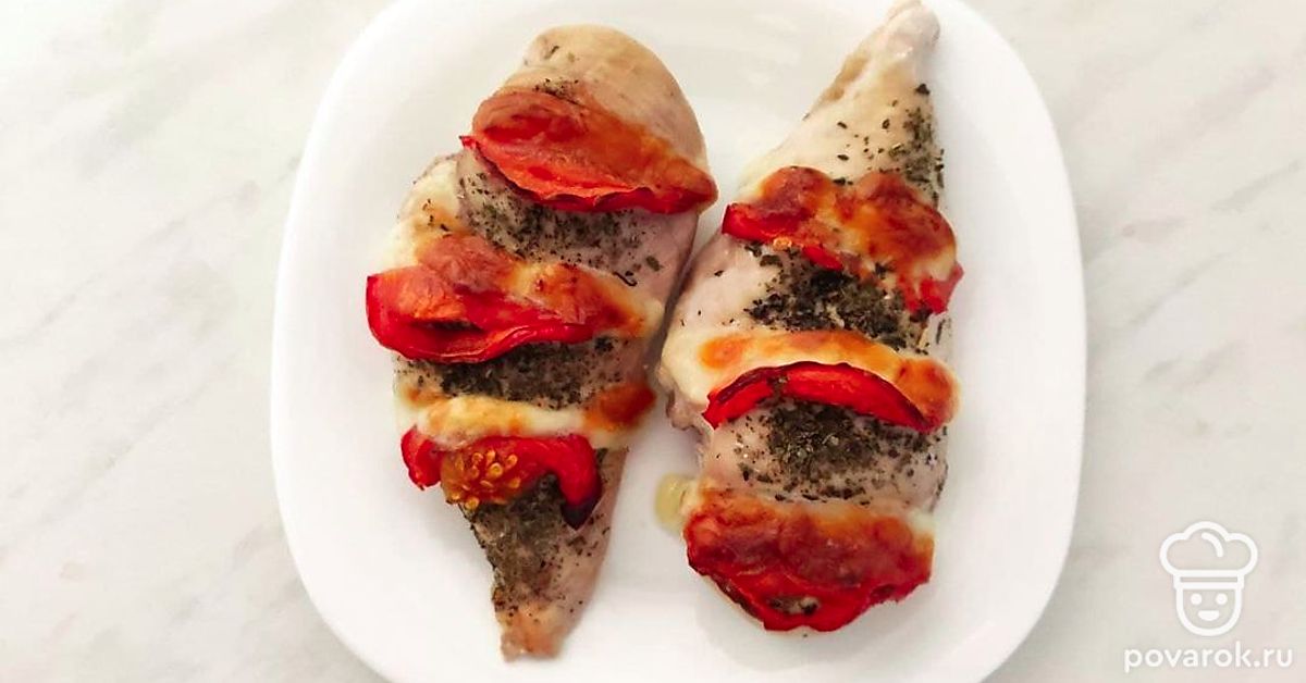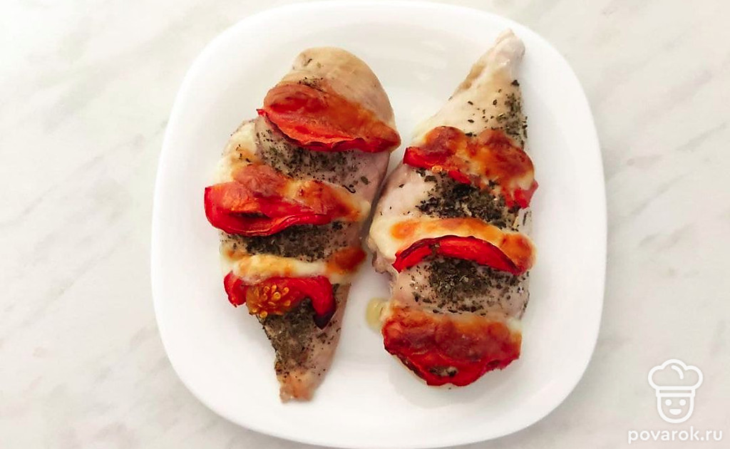 На застеленный фольгой противень выложите куриную грудку, в разрезы вставьте слайсы помидоров и сыра моцарелла. Посыпьте все сверху сушеным базиликом и полейте оливковым маслом. Поставьте запекаться в разогретую до 180℃ духовку на 35 минут.