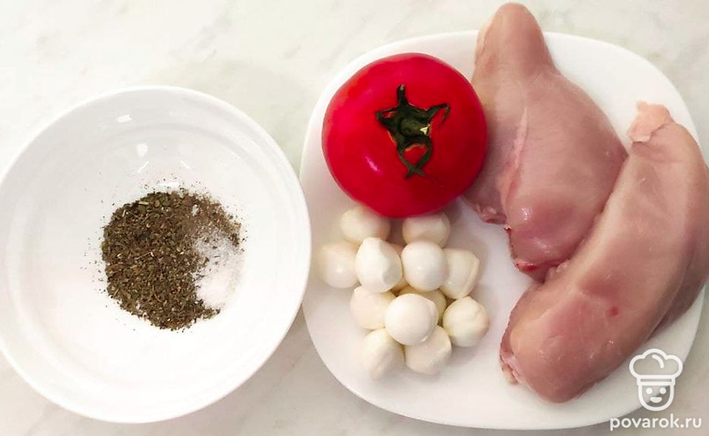 Промойте куриную грудку, помидоры и базилик в прохладной воде, удалите лишнюю влагу при помощи бумажных полотенец.