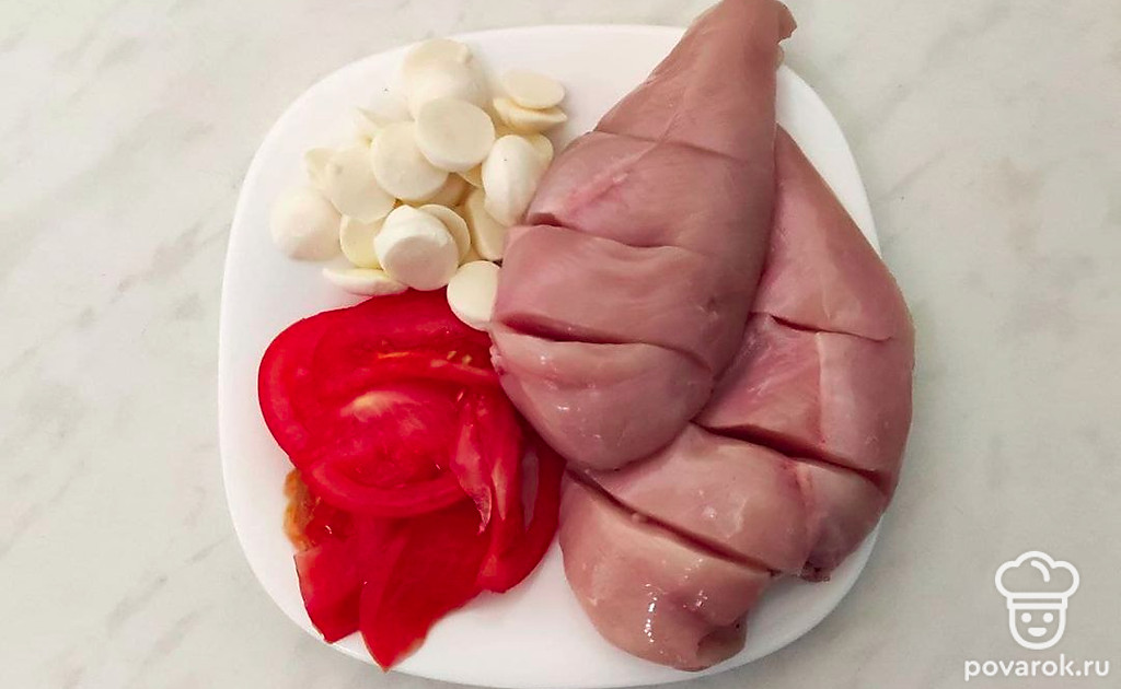 Нарежьте помидоры и сыр моцарелла тонкими слайсами. На куриной грудке сделайте поперечные глубокие разрезы практически насквозь, их должно быть как минимум 3 на каждой грудке.