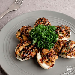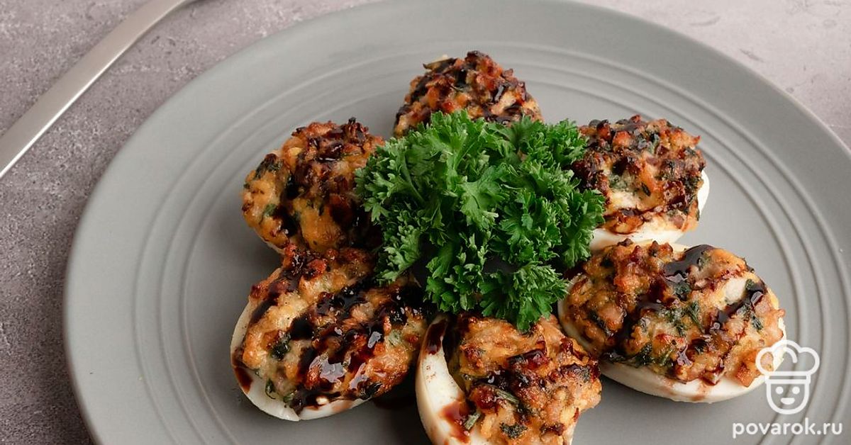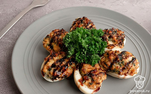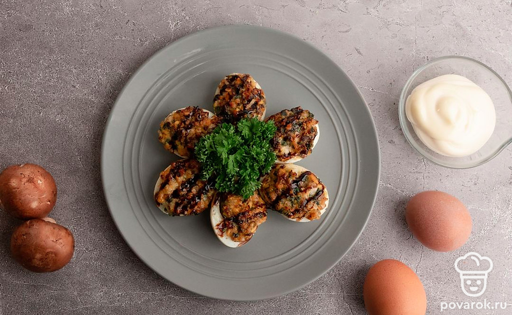 Яйца фаршированные грибами и сыром в духовке готовы! Выложите их на тарелку и украсьте свежей зеленью на свой вкус. Приятного аппетита!