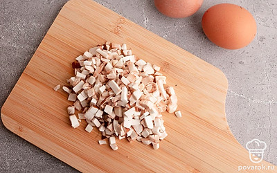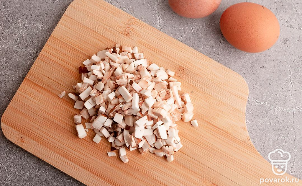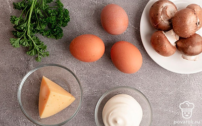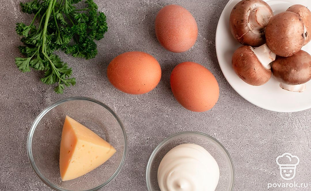 Подготовьте все ингредиенты. Заранее отварите яйца, промойте шампиньоны и зелень. Разогрейте духовку до 180 градусов.