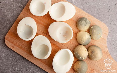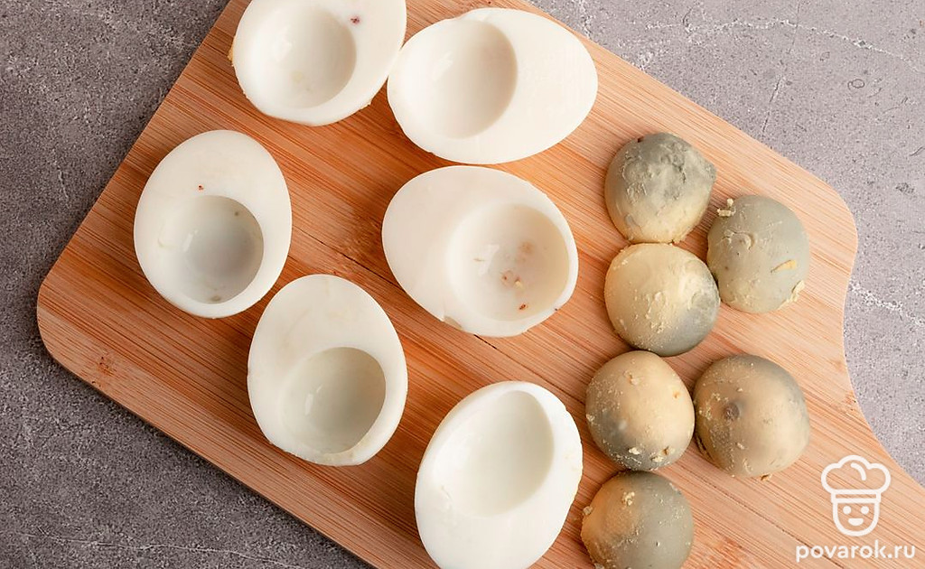 Вареные яйца очистите, разрежьте пополам острым ножом и выньте желтки.