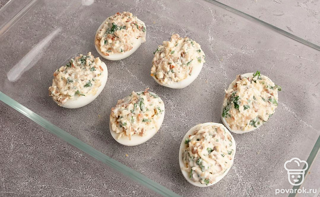 В половинки яиц аккуратно поместите начинку. Выложите яйца в форму для выпекания. Запейте в заранее разогретой до 180 градусов духовке в течение 10 минут.