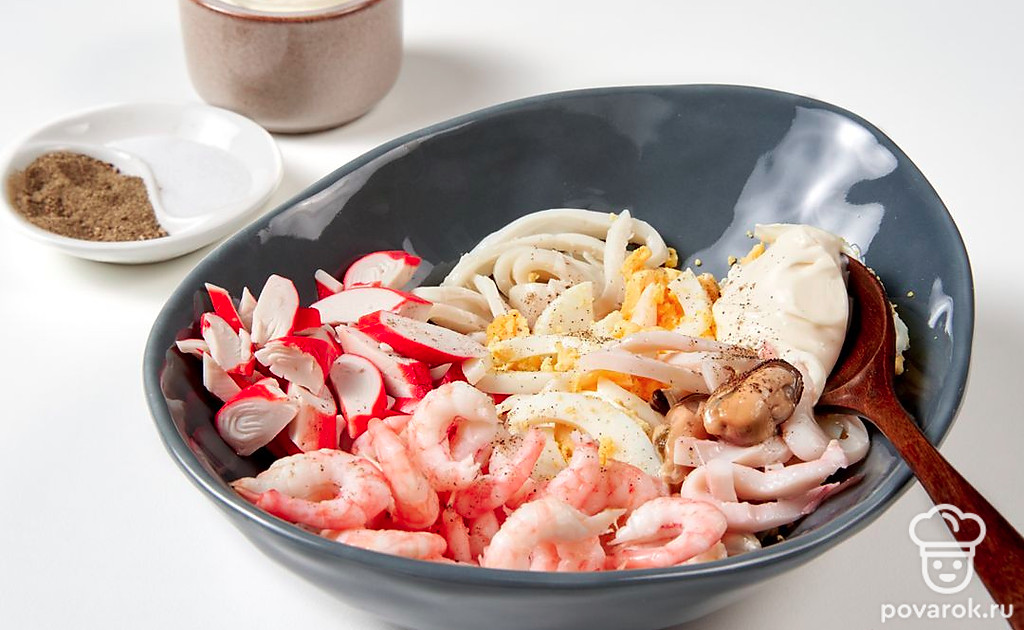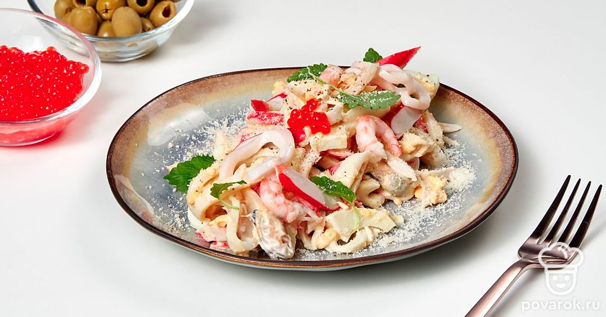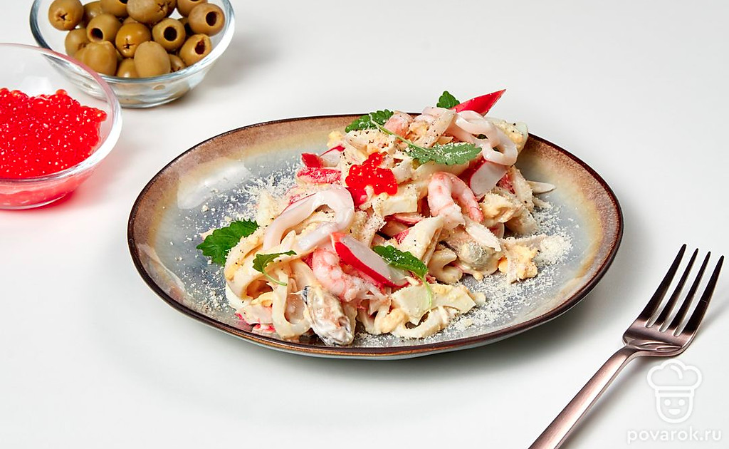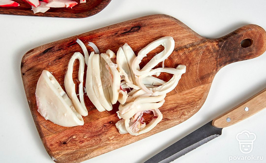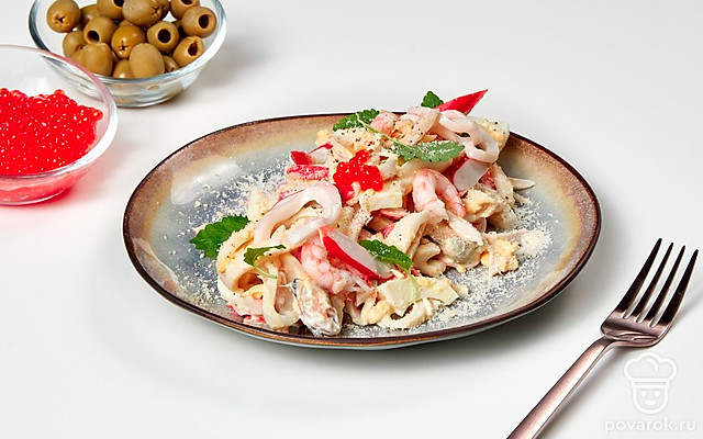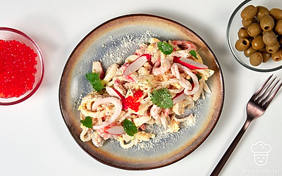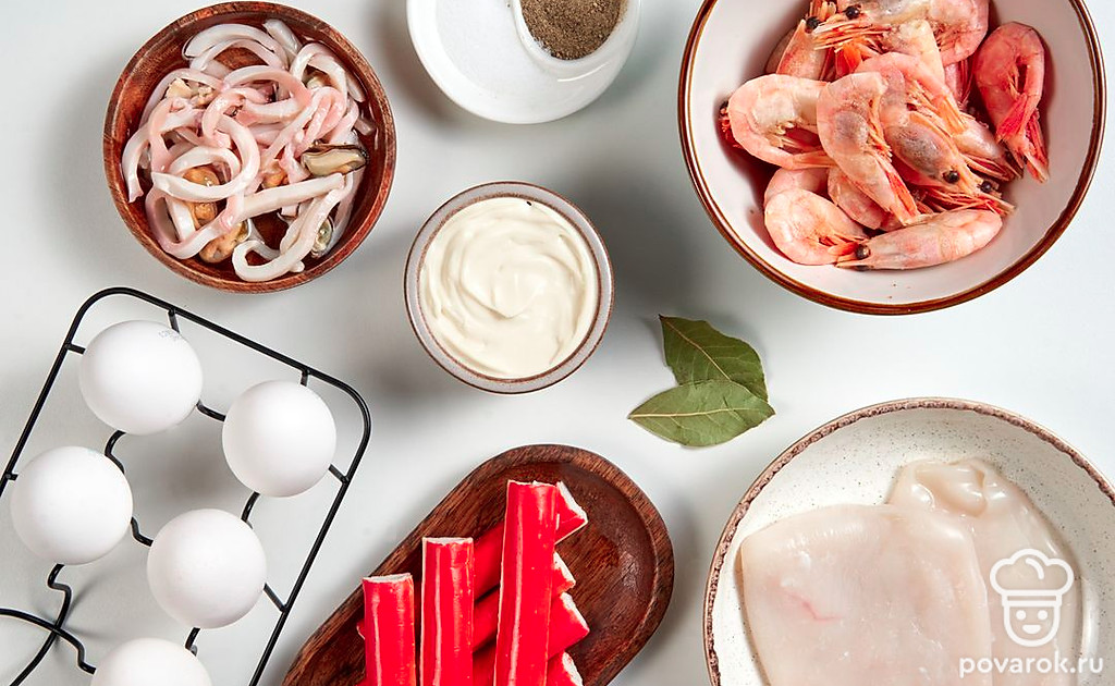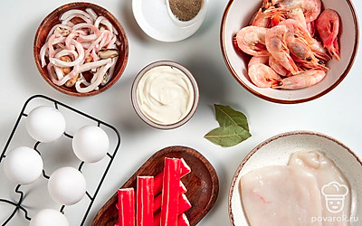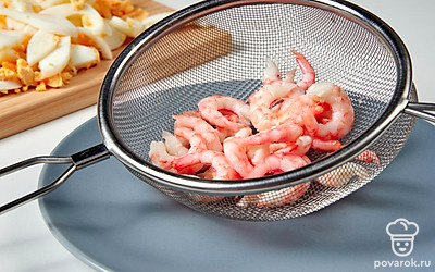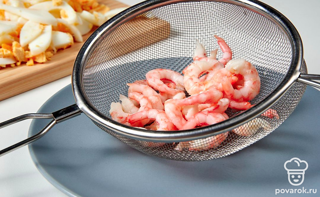 Для приготовления салата «Царский» в рецепте используются атлантические или северные креветки. Их варят неочищенными, что положительно сказывается на мясе ракообразных, а бульон получается насыщеннее. Также хитиновый слой защищает мясо от соли, сохраняя его мягким и нежным. Качественные креветки всегда с ровной окраской, гладким панцирем и подогнутым хвостом. Лучшие креветки — свежезамороженные, серо-бурого цвета. В них сохраняется множество полезных веществ, а также насыщенный вкус.