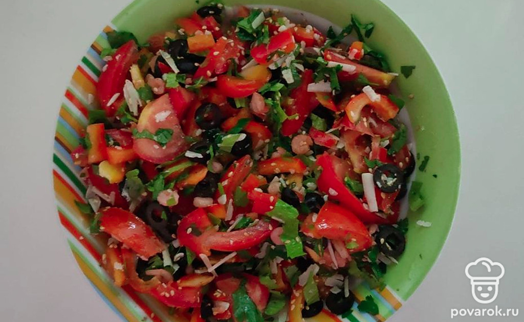 Сделайте нарезку овощей и получите сок лимона. Помидоры нарежьте дольками, перец – кубиками или соломкой, а зелень мелко нарубите ножом. Соедините все продукты в большой миске, заправьте растительным маслом и перемешайте.