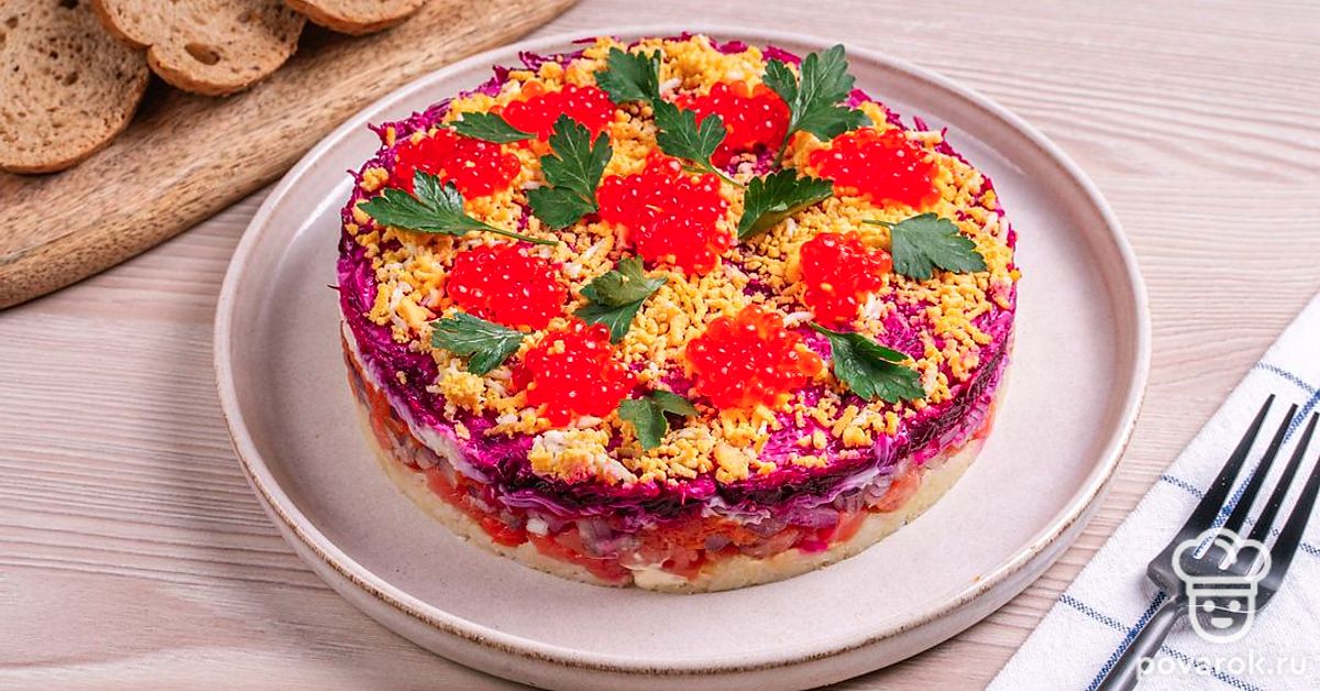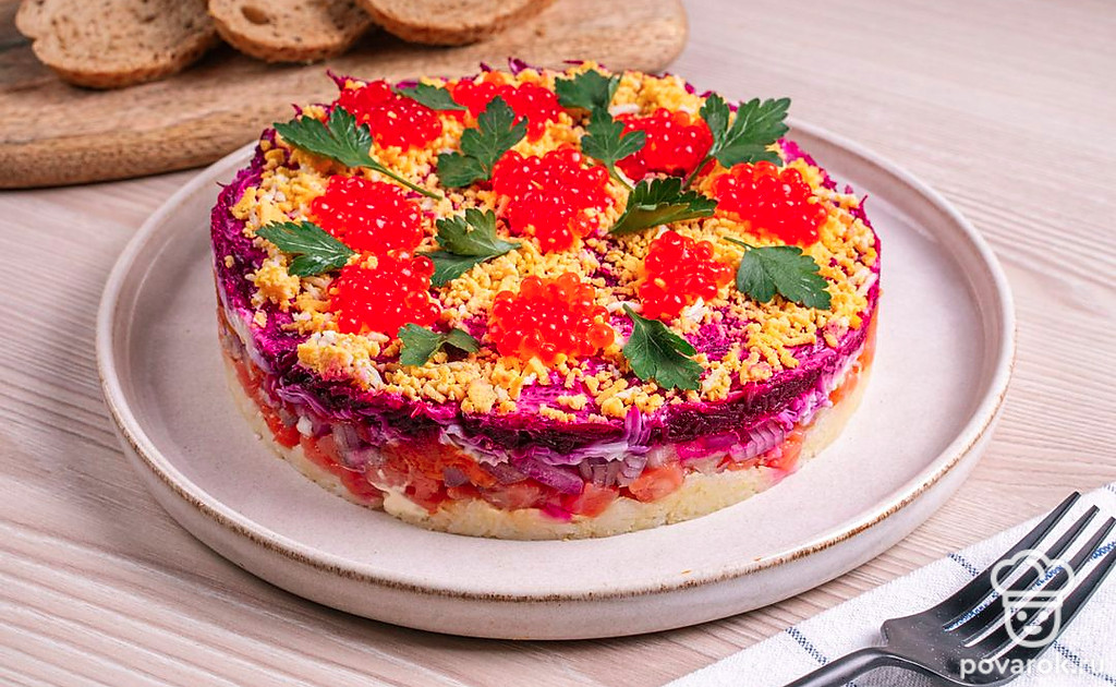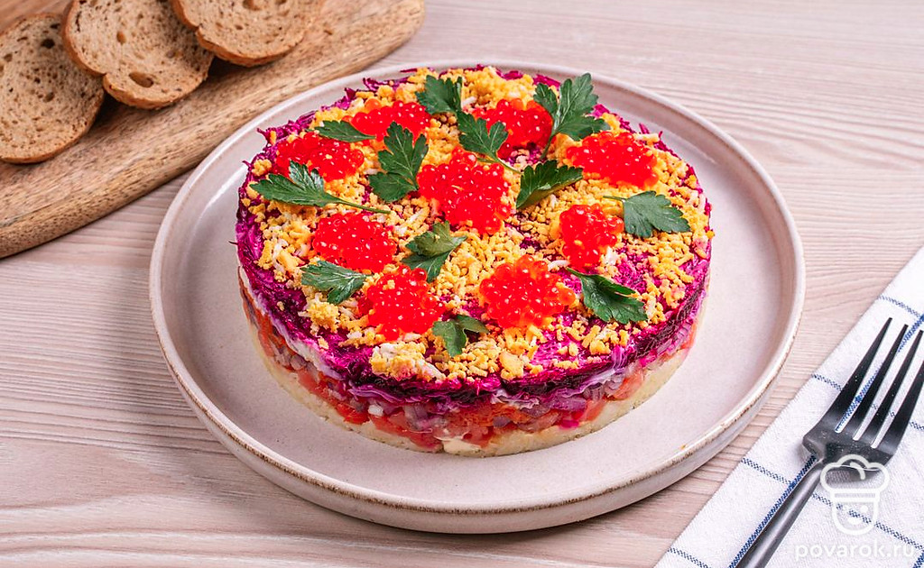 Не игнорируйте шаг с декором красной икрой. Так салат будет выглядеть очень дорого и празднично.