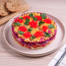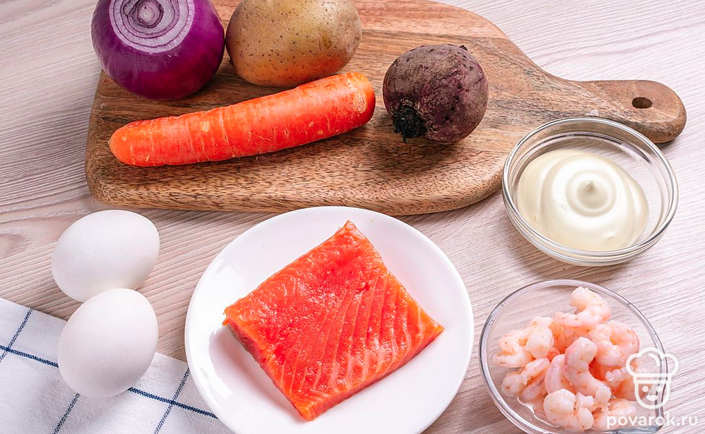 «Царская шуба» с красной рыбой и креветками — сочетает в себе два интересных акцента. Мелко нарезанный лук, воздушная подушка из овощей и яиц лишь дополняет главных солистов, не забивая собой нежный маслянистый вкус.