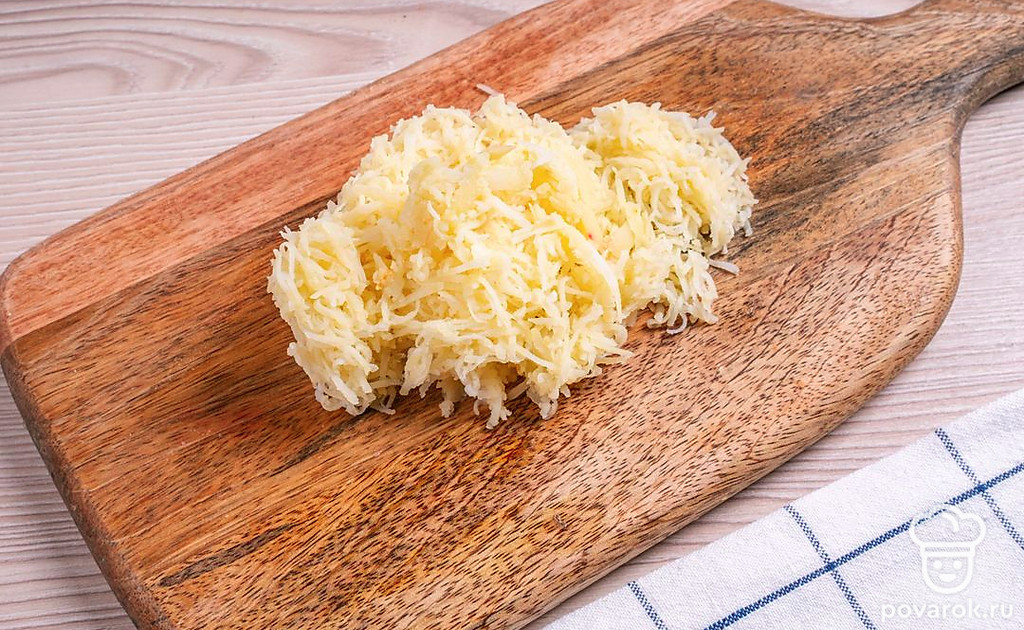 На мелкой терке натрите картофель, предварительно сняв с него кожицу.
