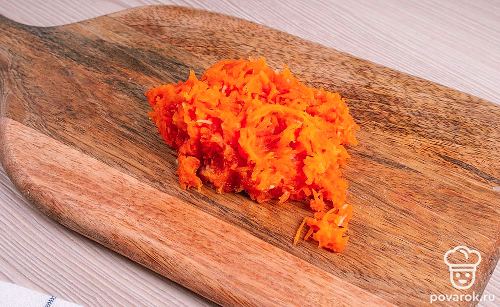 Почистите морковь, натрите ее на мелкой терке. Не пытайтесь оставлять крупные кусочки, с их помощью салат утратит свою сказочную воздушность.
