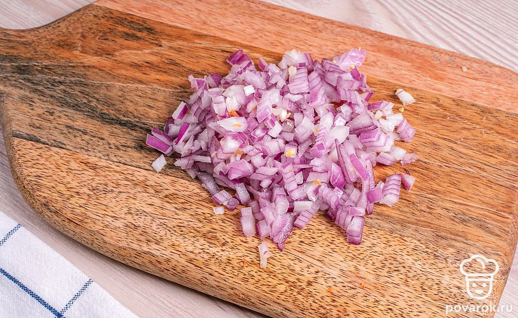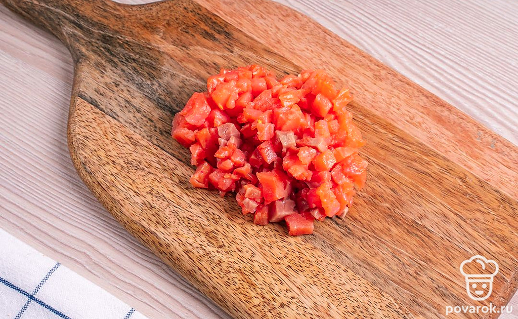 С красной рыбы снимите кожу, поддев ее ножом. Затем нарежьте мелким кубиком.