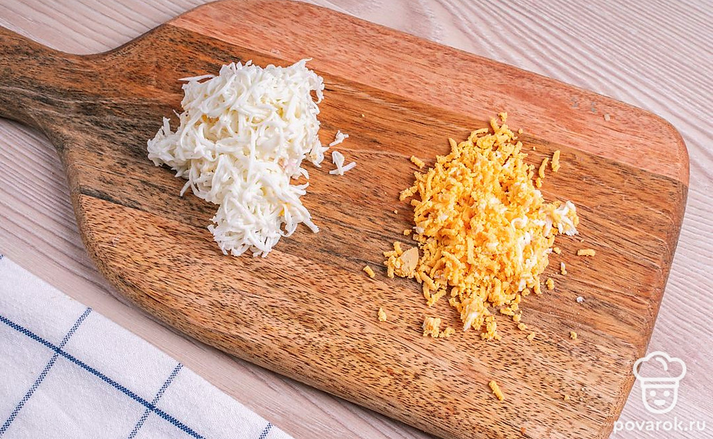 Снимите с яиц скорлупу, разделите белки и желтки. Сначала потрите на мелкой терке белки, затем желтки, разместив натертое в разные мисочки.