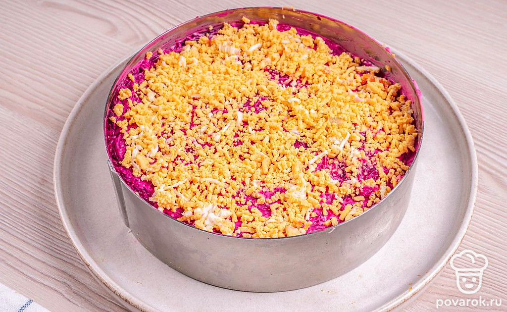Соберите салат. Для этого возьмите кулинарное кольцо. Запомните, что после каждого слоя необходим тонкий слой майонеза. Слои по порядку: картошка, рыба, лук и морковь, белок, свекла. Финиш — распределите сверху натертый желток, не стараясь сделать однородный слой.