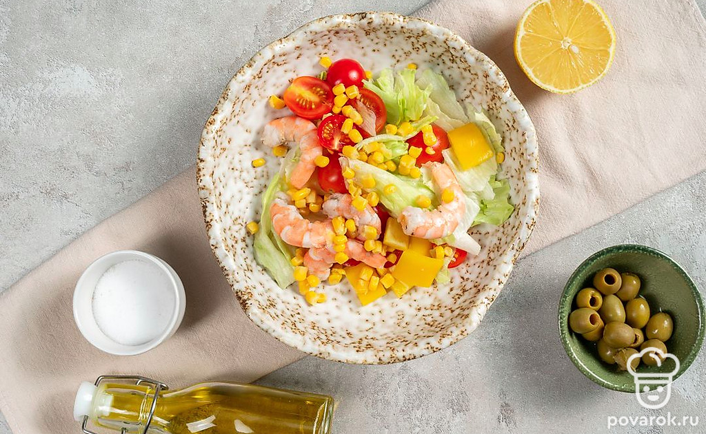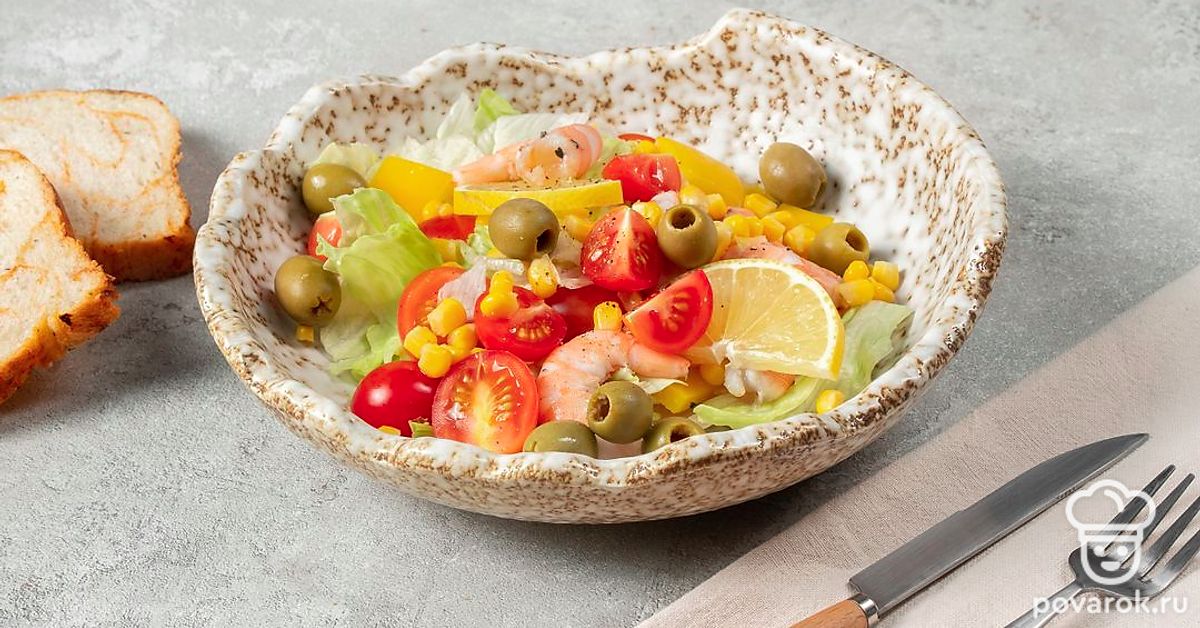 Яркий и питательный салат с кукурузой и креветками подходит для обычного и праздничного стола. Закуска очень простая в исполнении, при этом прекрасно вписывается в диетическое меню. При соединении с другими ингредиентами креветки, казалось бы, постный продукт, раскрываются, и вкус их становится ярким и неповторимым. Сочная кукуруза, сладкий перец и свежие томаты наполнят это быстрое блюдо потрясающими красками.