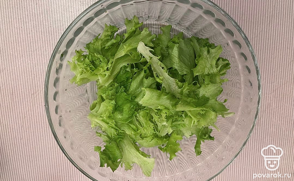 Салат-латук хорошо помойте, просушите бумажными полотенцами. Нарвите крупными кусками.