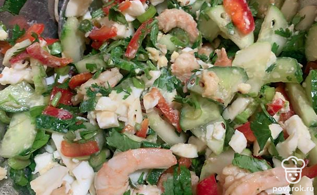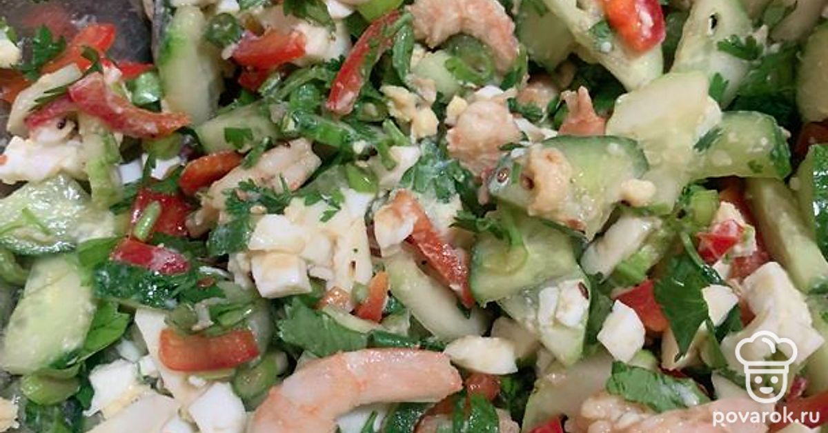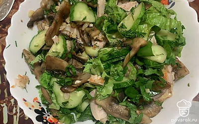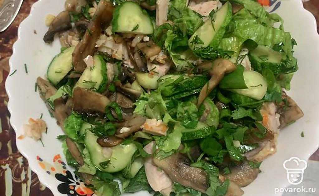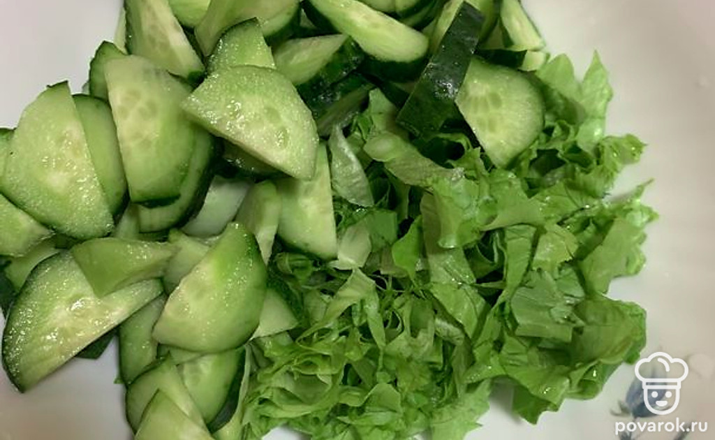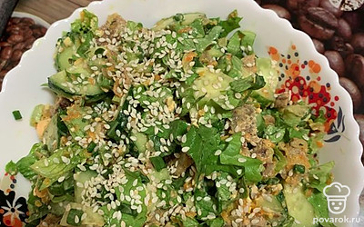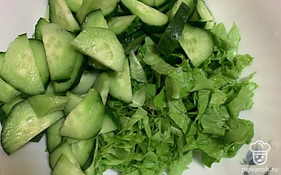 Нарежьте огурцы, листовой салат, свежую зелень. Заправьте соевым соусом, лимонный соком или оливковым маслом.