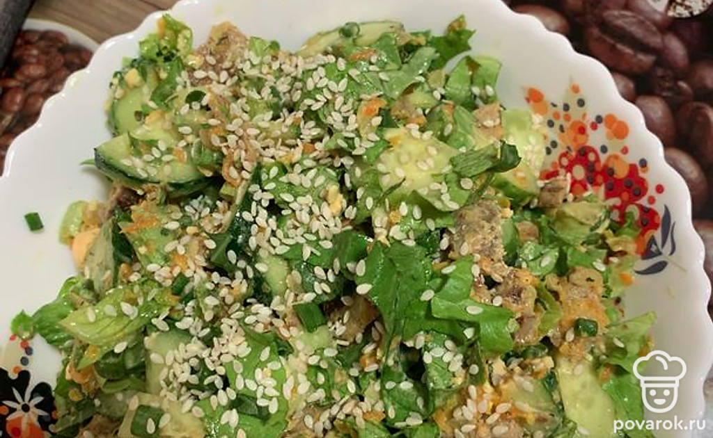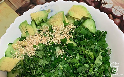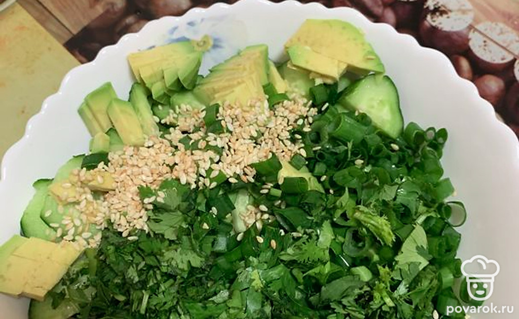 Добавьте авокадо и слегка обжаренные семена кунжута.