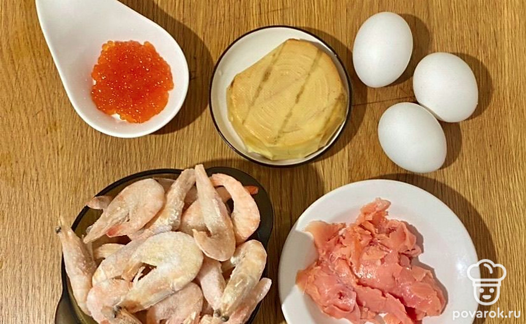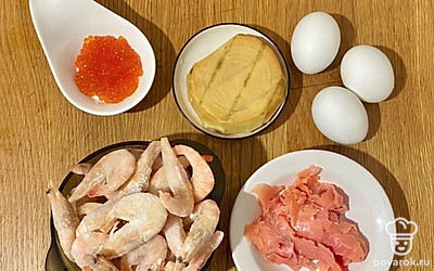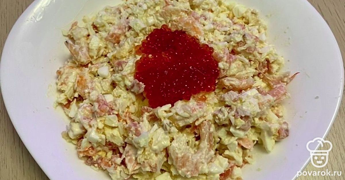 Праздничный салат с креветками, красной рыбой и красной икрой