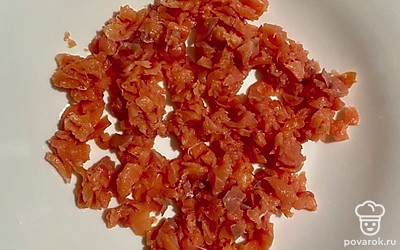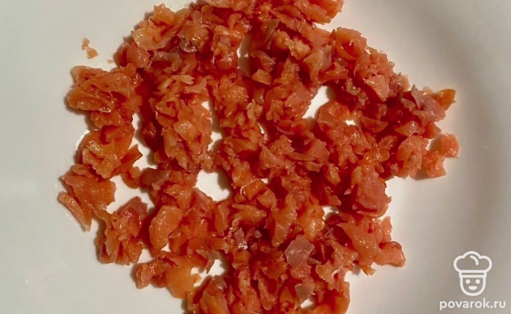 Первым слоем выложите мелко нарезанную красную рыбку.