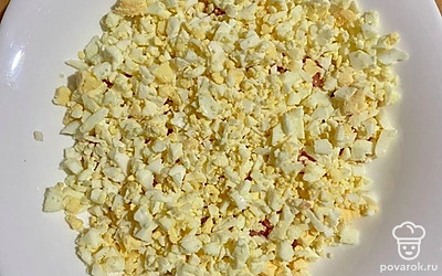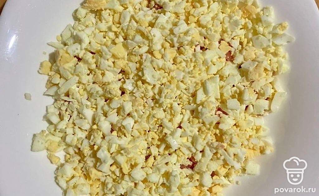 Яйца почистите и мелко нарежьте. Выложите на красную рыбу.