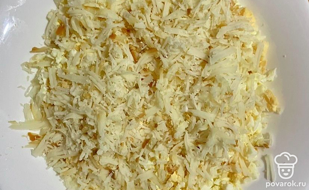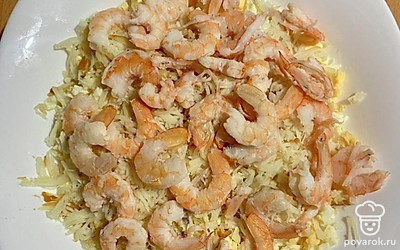 Креветки отварите и выложите поверх сыра. Заправьте салат майонезом, посолите и перемешайте. Готово!
