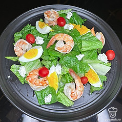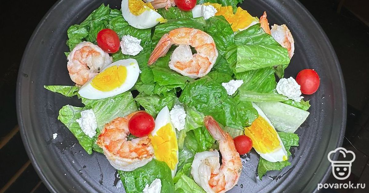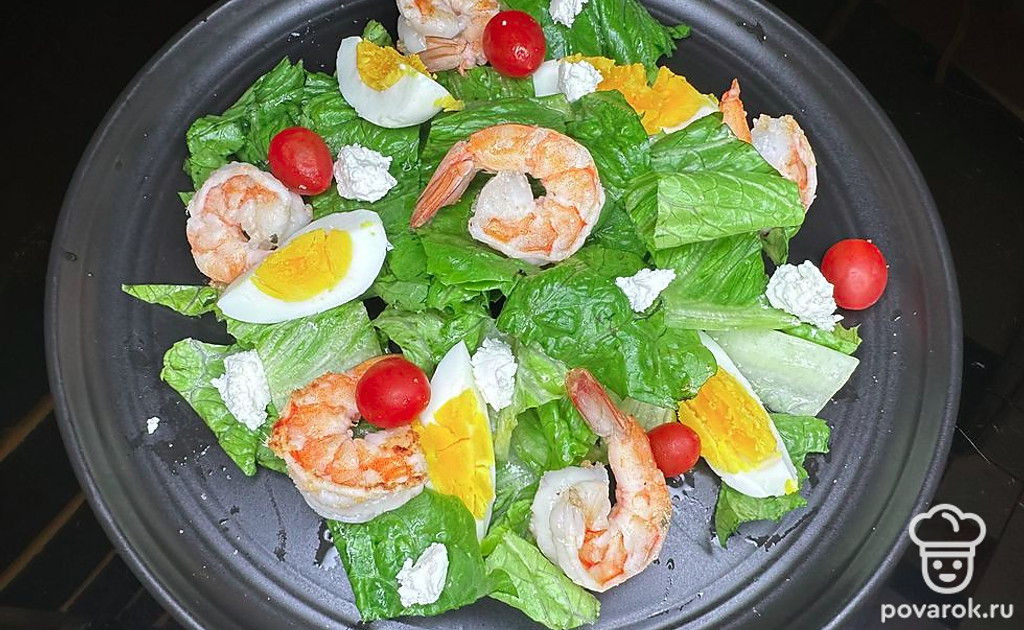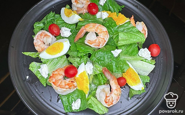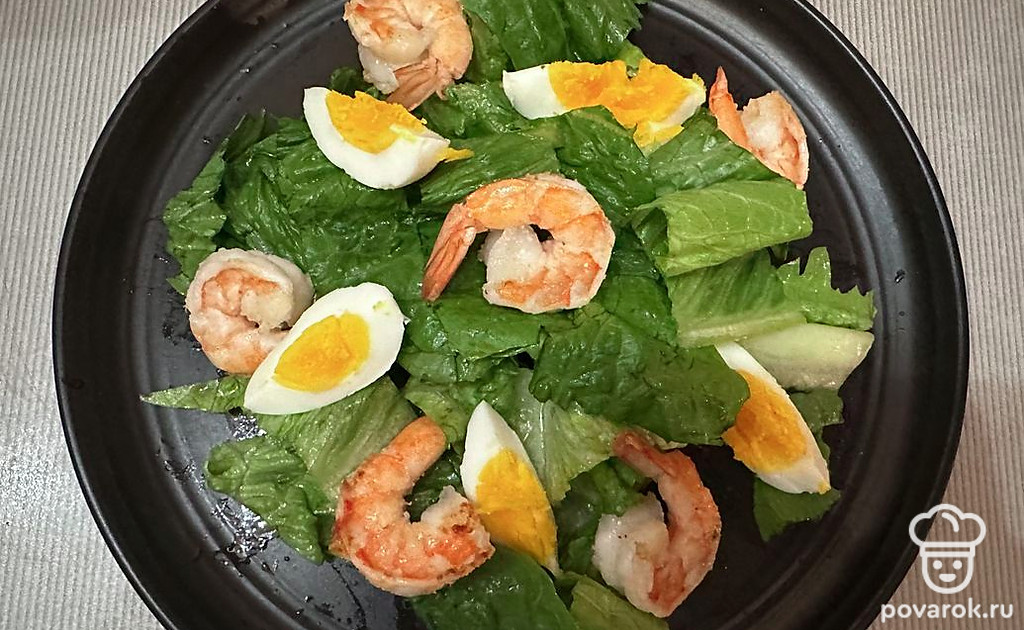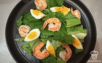 Яйцо отварите вкрутую, почистите. Нарежьте дольками. Выложите сверху на листья салата. Также разложите обжаренные тигровые креветки.