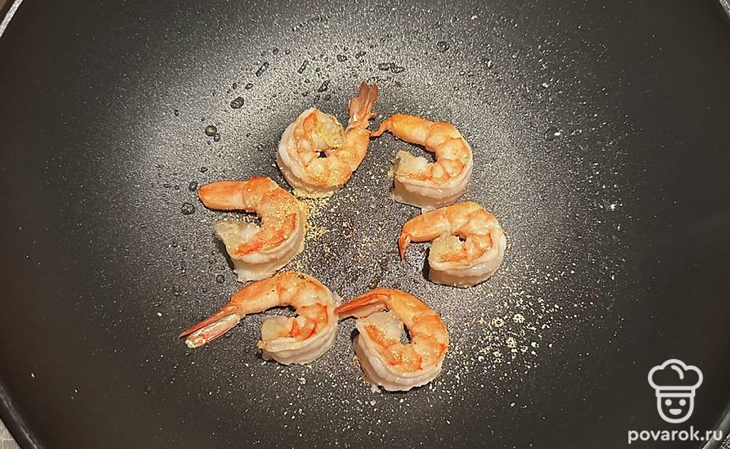 Тигровые креветки почистите, удалите пищевод. Обжарьте на разогретом растительном масле с двух сторон. Добавьте по вкусу соль и сушеный чеснок.