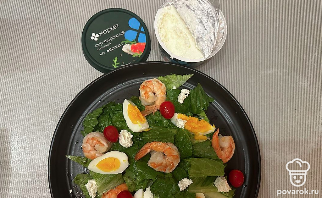 Помидоры черри помойте и выложите сверху на салат. Творожный сыр при помощи кофейной ложечки отделите на маленькие кусочки и выложите на салат.