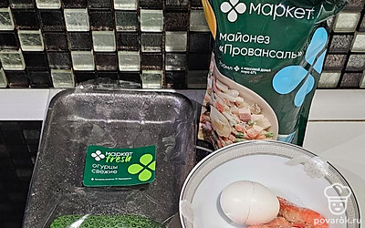 Подготовьте все ингредиенты. Яйцо отварите. Креветки залейте кипятком, оставьте на 10 минут. Почистите.