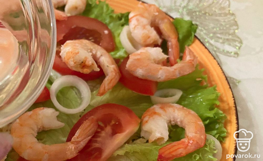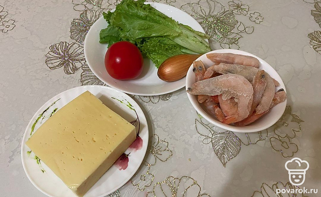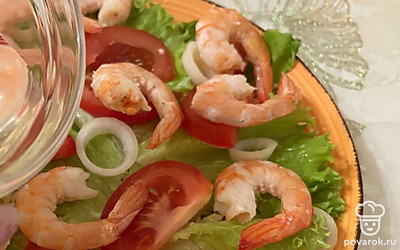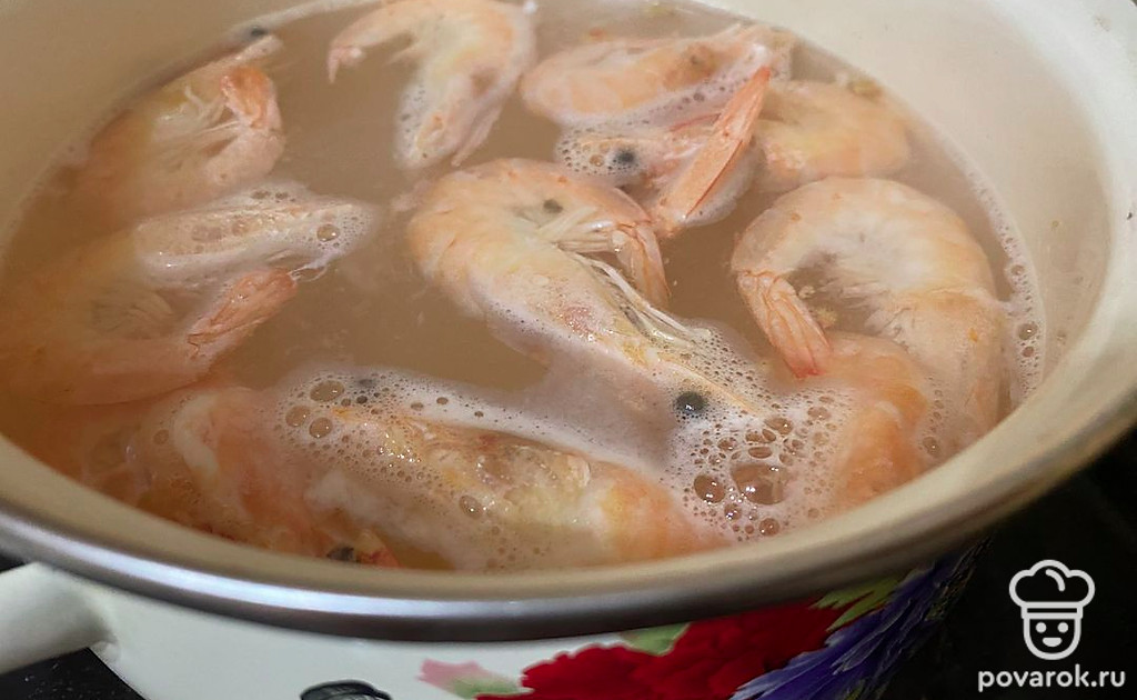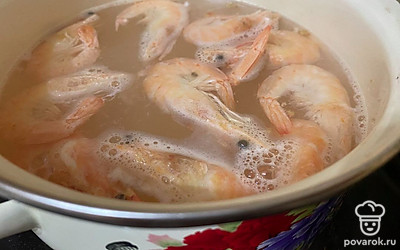 Отварите креветки до готовности, примерно 3 минуты с момента закипания. Слейте воду. Остудите.