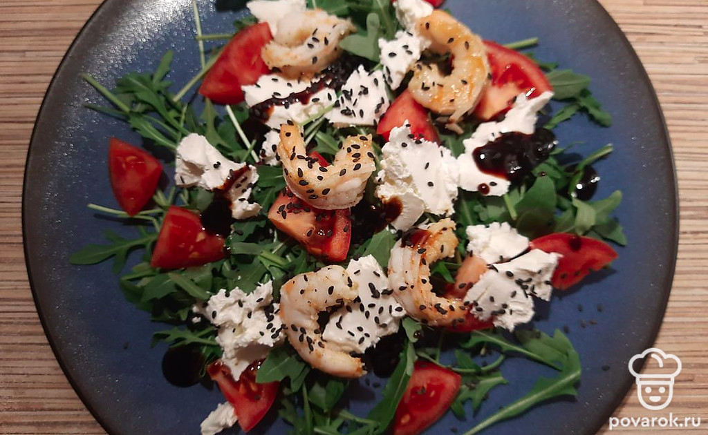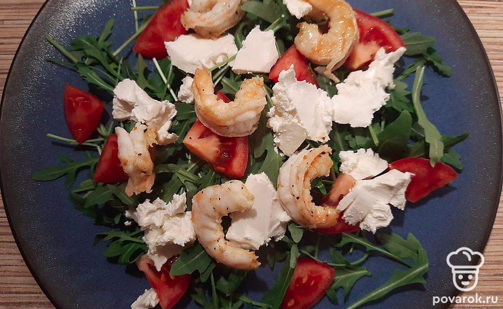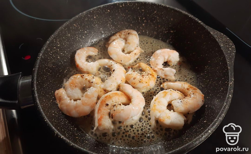 Креветки обжарить 3 минуты на сливочном масле, добавив немного соли и перца.
