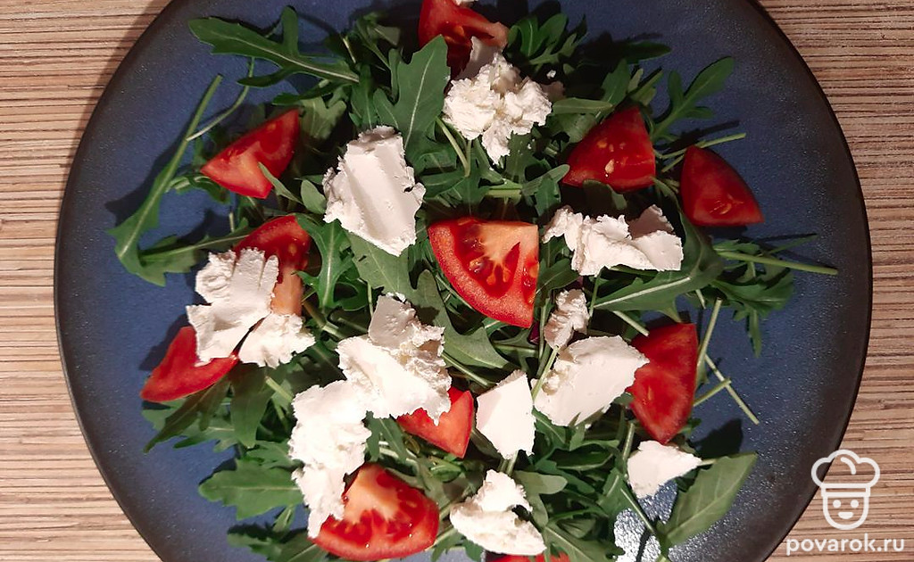Помидоры порезать крупными кусочками и выложить на салат. Добавить сыр.