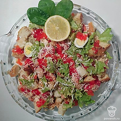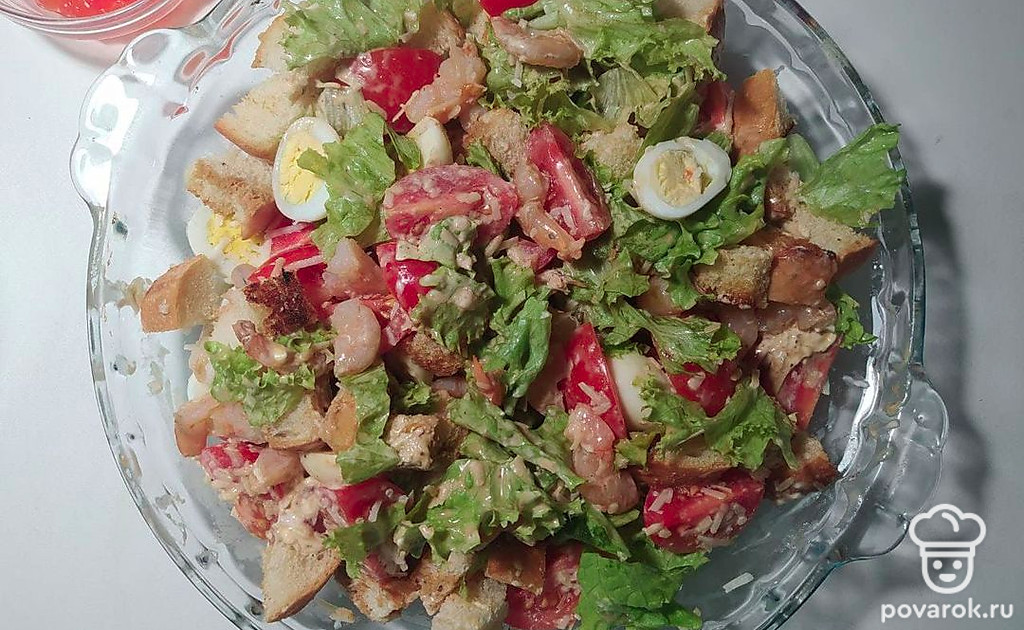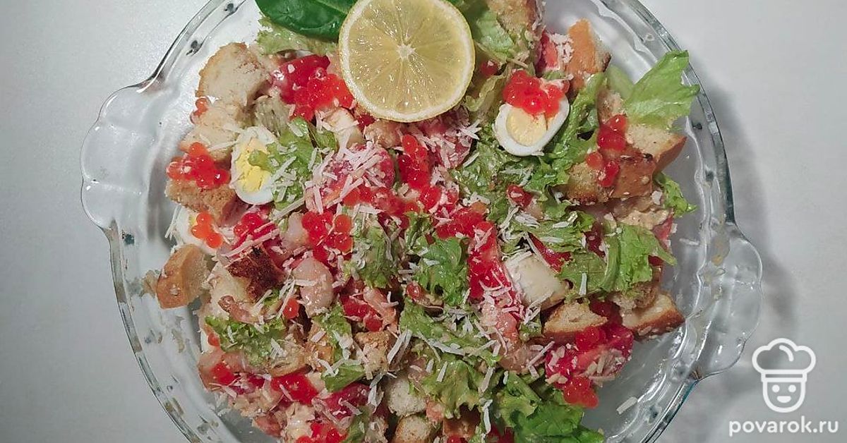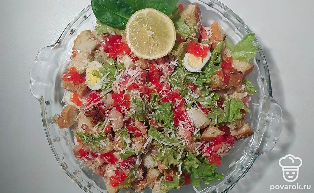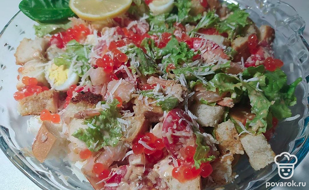 Салат, который включает в себе такие полезные продукты как перепелиные яйца, креветки, помидоры черри, красную икру и сыр Пармезан, не оставит равнодушными никого. Кисло-сладкая заправка благодаря сочетанию лимонного сока, майонеза и соевого соуса придает пикантности блюду.
