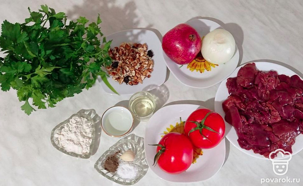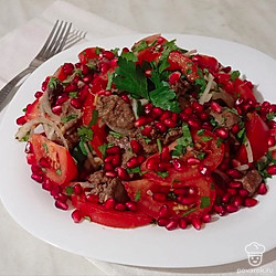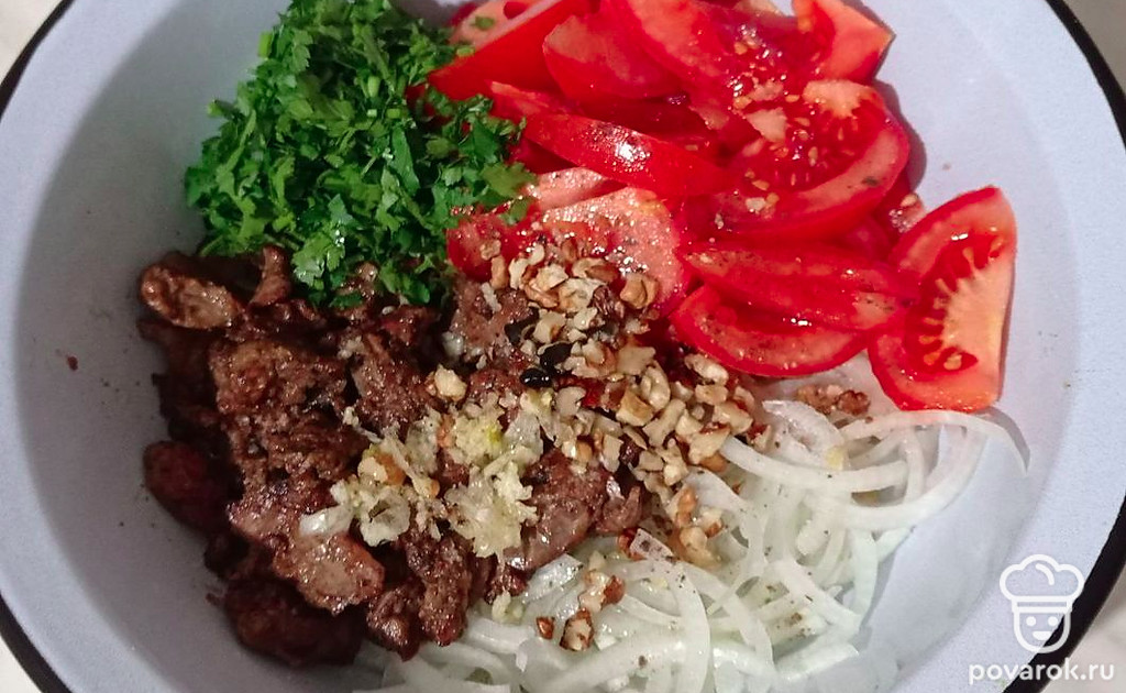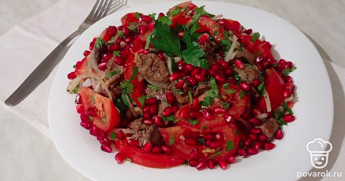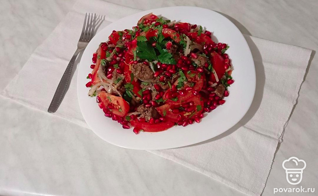 Если Вы любитель классической кавказской кухни, обязательно приготовьте салат «Грузия» с куриной печенью, овощами, орехами, гранатом. Блюдо получается сочное, яркое, довольно сытное и полезное. Так как в нем присутствует много свежей зелени, сладкие, спелые помидоры, острые лук и чеснок, нежнейшая куриная печень, грецкие орехи со своим насыщенным вкусом. А пикантность и шик салату придают изысканные, рубиновые зерна граната.