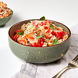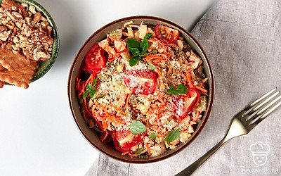 Подавайте салат «Царский» с копченой курицей, посыпав измельченными грецкими орехами. По желанию украсьте салат нарезанными помидорами и листиками шпината.