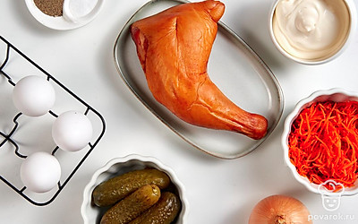 Салат «Царский» с копченой курицей получается очень интересным. Копченое мясо курицы и корейская морковка замечательно дополняют друг друга, делая закуску сытной, пикантной и придают восхитительный вкус салату. Маринованный огурец добавляет едва уловимую кислинку, подчеркивая достоинства мясных продуктов, при желании его можно заменить свежим. Вместо майонеза салат можно заправить пикантным соусом на основе несладкого йогурта, смешанного с горчицей и чесноком.