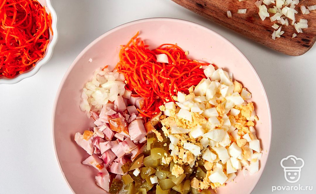 Приготовьте салат. Курицу, маринованный огурец и яйцо нарежьте маленьким кубиком, положите в салатницу. Репчатый лук мелко покрошите, добавьте к остальным овощам. Морковь тоже положите в салатницу.