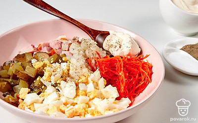 Заправьте салат. Добавьте к салату майонез, соль и перец, все хорошо перемешайте.