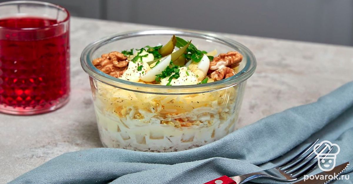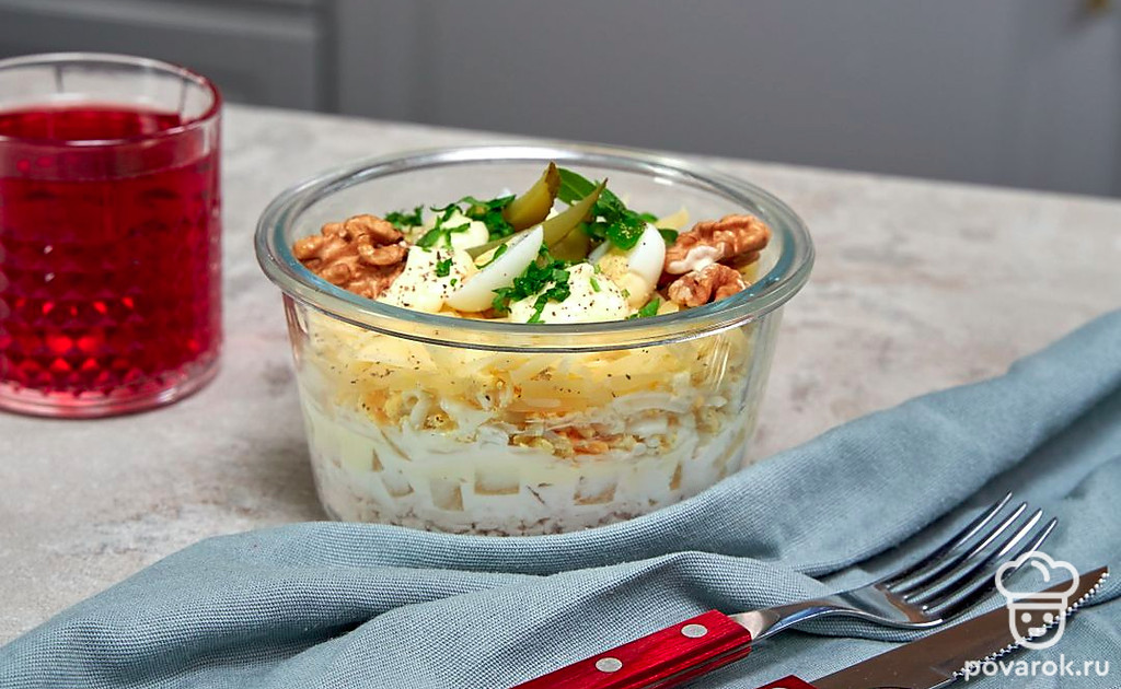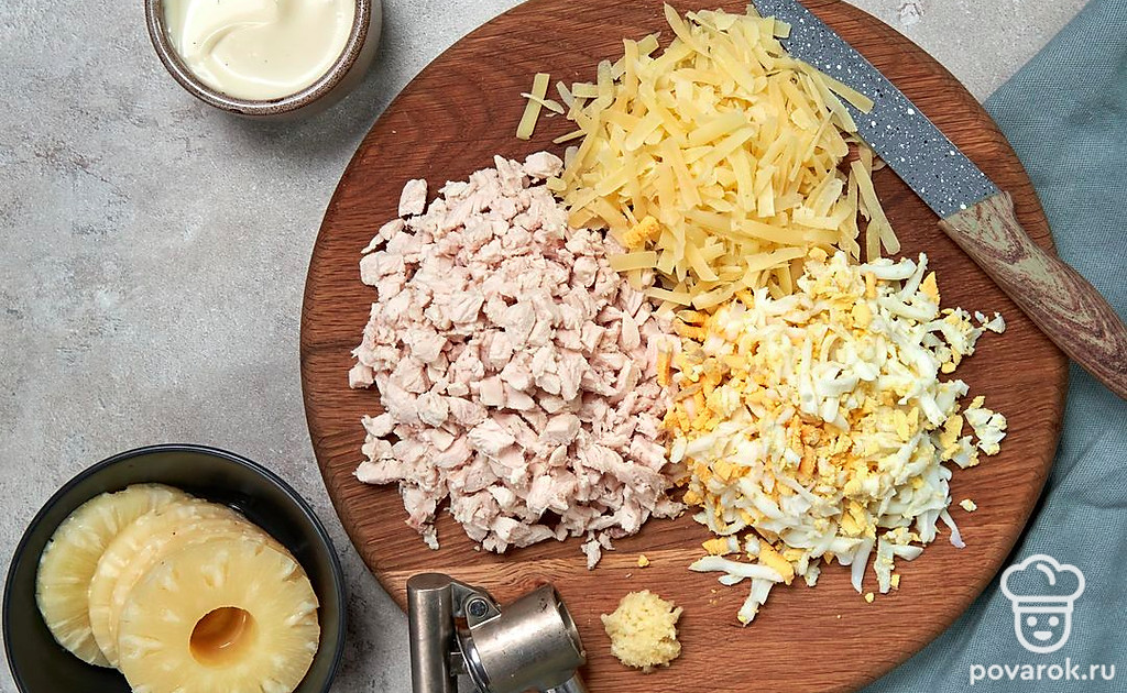Консервированные ананасы — прекрасная альтернатива свежим. Их можно употреблять как самостоятельное блюдо, а также добавлять в салаты и десерты. Из ананасов и курицы получается очень нежный салат, в котором прекрасно сочетаются простые продукты. Присутствие ананаса очень обогащает вкусовой букет. А формирование слоями делает блюдо нарядным и достойным праздничного стола.