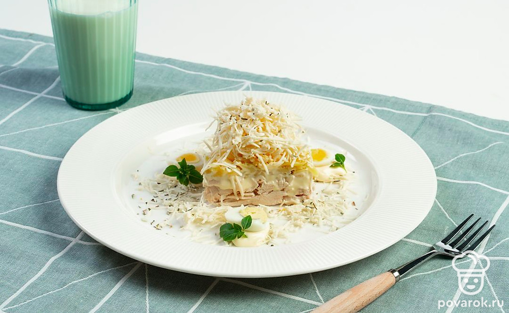 Чтобы легко наносить майонез, обрежьте уголок пакета с соусом и укладывайте его сеточкой на поверхность слоя.