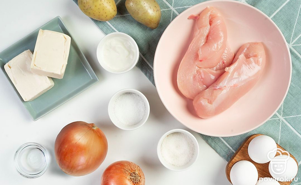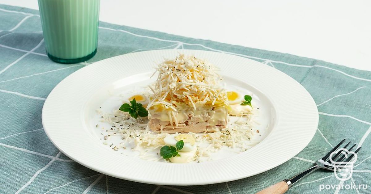 Приступите к формированию слоеного салата. На большую тарелку первым слоем выложите курицу, затем слой майонеза. Далее разложите маринованный лук. Следующим слоем посыпьте отварной картофель. Сверху распределите майонез и измельченные яйца. На них натрите плавленый сыр.