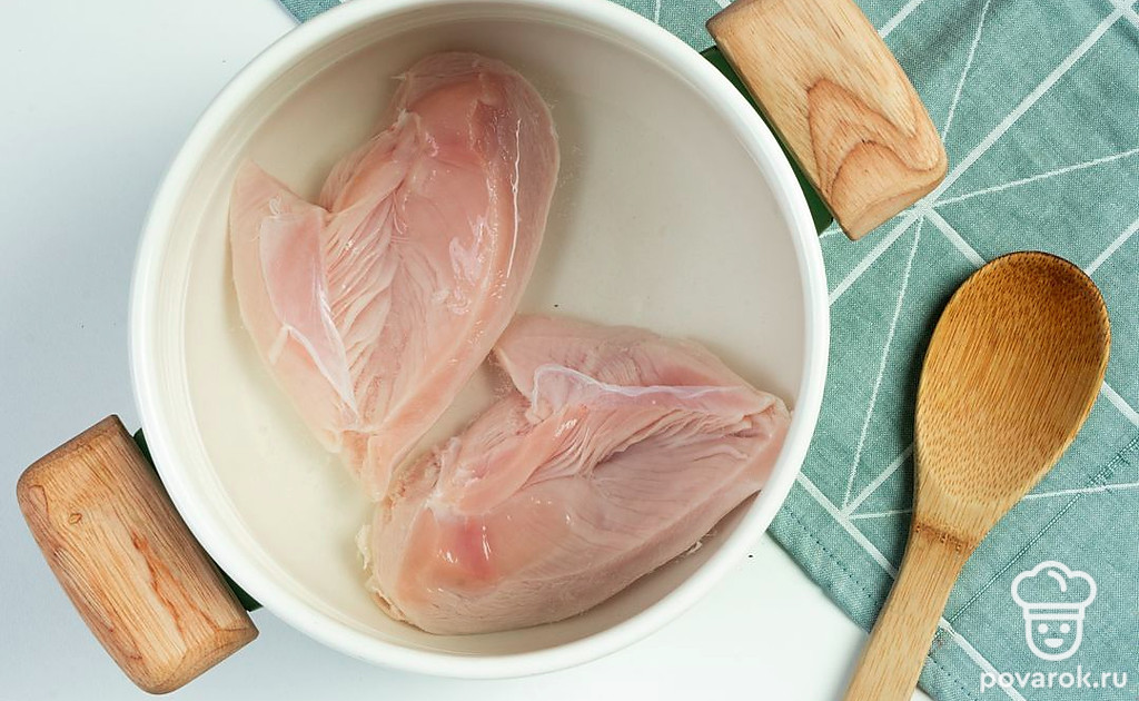 Отварите куриное филе. Установите кастрюлю с водой на средний огонь, опустите в воду куриное мясо, посолите и варите приблизительно 30 минут. Затем курицу остудите и измельчите ножом или разделите на волокна руками.